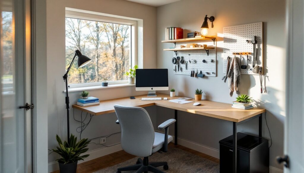 Vertical storage is your best friend in tight quarters. Floating shelves above the desk hold reference books, supplies, and decorative items without taking up floor space. A tall, narrow bookcase works better than a low, sprawling credenza. Wall-mounted cabinets or pegboards keep frequently used tools visible and within arm’s reach.